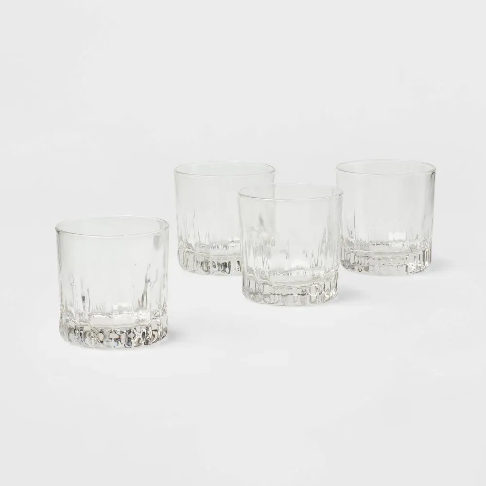 Este paquete de cuatro vasos presenta un exterior acanalado con un borde y una base redondos para una apariencia clásica