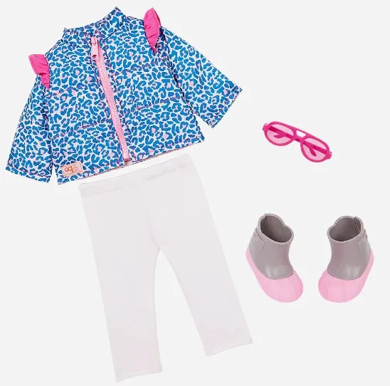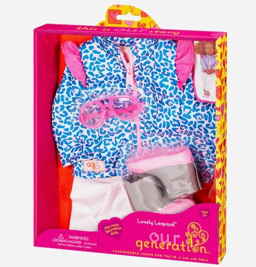 Recomendado para edades de 3 años en adelante ¡Hazte notar a la moda con el atuendo Our Generation Lovely Leopard para muñecas de 18 pulgadas! Incluye: chamarra de leopardo con lindas gorras con volantes en las mangas, un par de lentes de sol, pantalones casuales y un par de botas